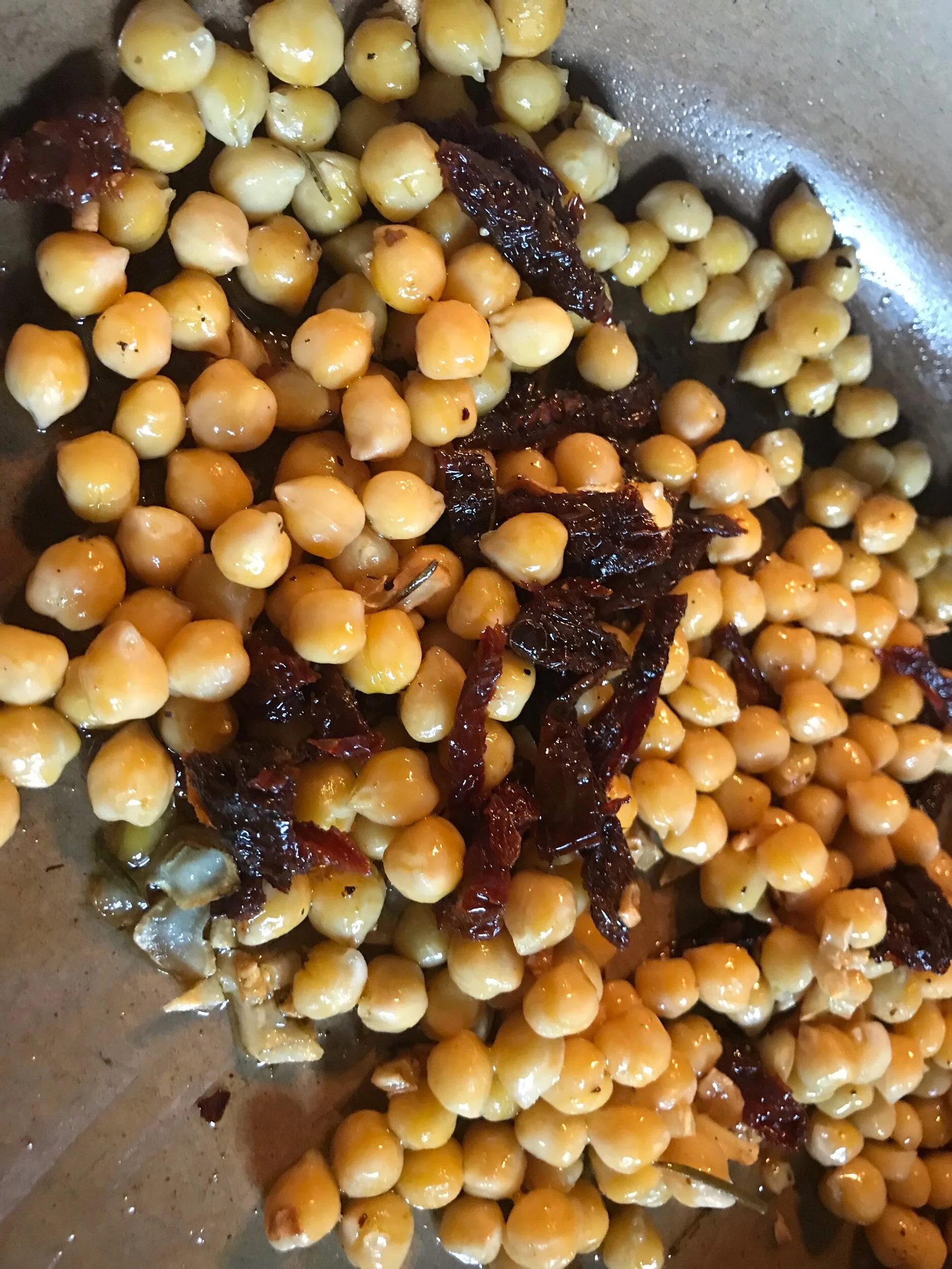 Cook the pasta in salted boiling water to al dente and drain, saving one cup of cooking water. Meanwhile, sauté the garlic in olive oil on low heat for one minute but don’t burn. Add chick peas and tomatoes and stir until heated through. Add pasta to pan and a little water if needed to get a cohesive consistency. Add other ingredients, stir, season to taste with salt and pepper and serve.