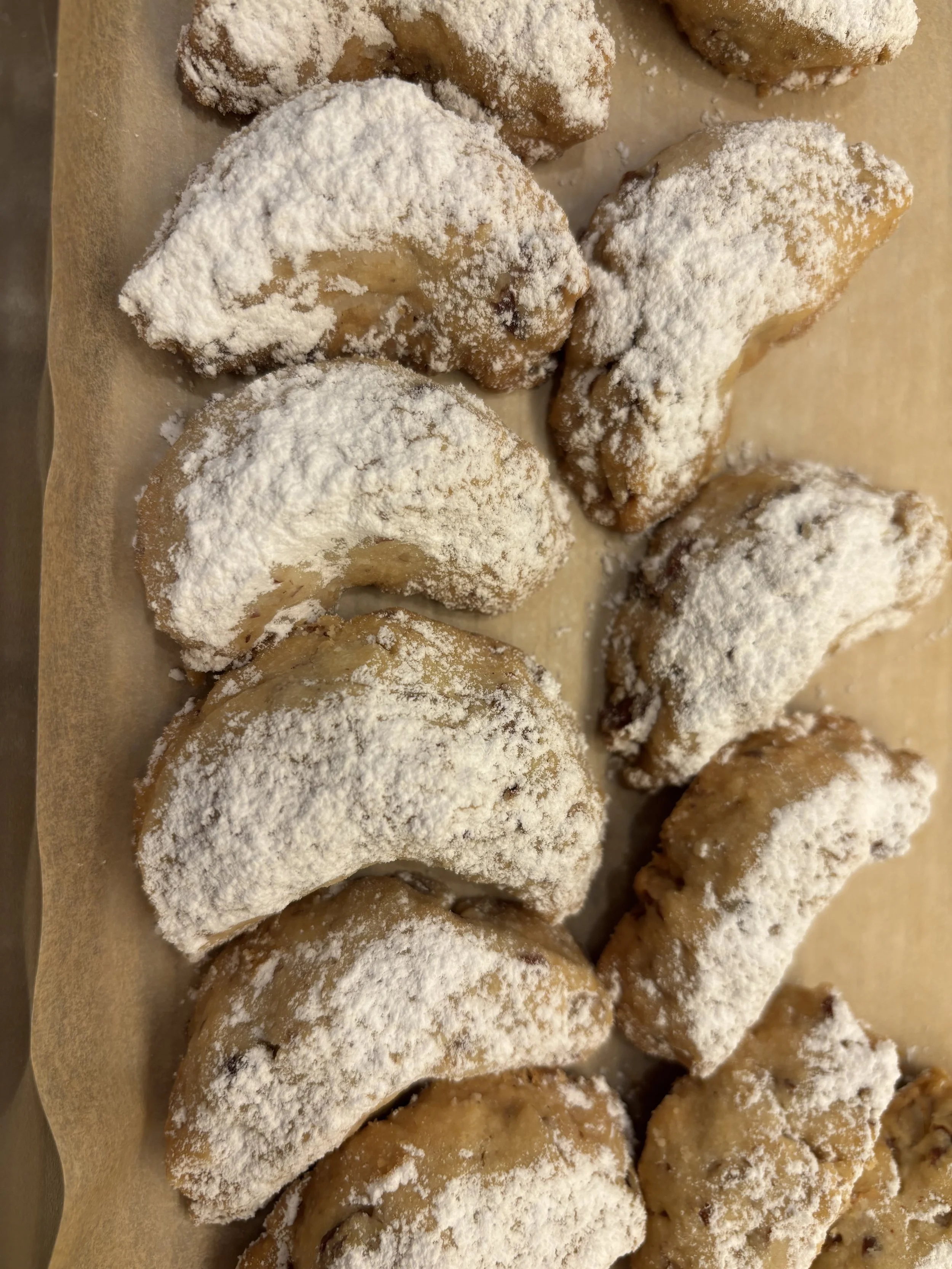 Shape small pieces of dough into crescents and place on parchment lined sheets. Bake 30 mins. Once cooled, roll in more powdered sugar or just sprinkle them.